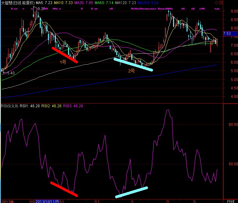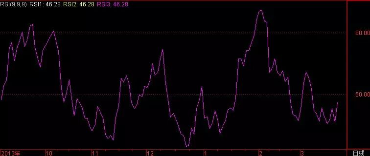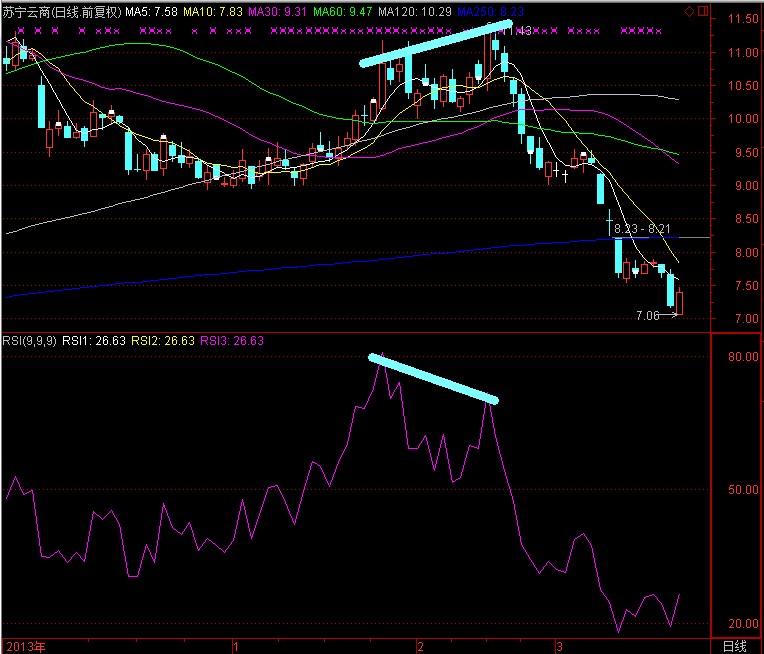 这是阳煤化工2014年的走势,股价不断制造新低,但是RSI却不断发生背离。我们仔细观察可以发现,每次下跌,RSI都落在20以下,也就是超跌区里,这说明它的下跌力度依然非常强。因为我们在判断背离的时候,要考虑进这一因素,一切以趋势的力度为根本。