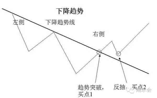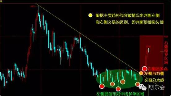 具体方法是:若价格以收盘价有效突破趋势线,意味着此前的趋势结束,新的趋势很可能产生,由此判断左侧和右侧交易,即突破前逆势操作为左侧交易性质,突破后按照新趋势操作为右侧交易性质。如图: