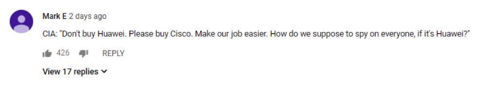 翻译:CIA:你们别再买华为的产品了,还是买美国思科的吧。这样的话我们CIA的工作才能轻松一点,不然你们都用华为了我们还怎么监控你们?