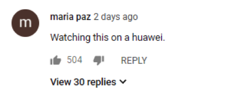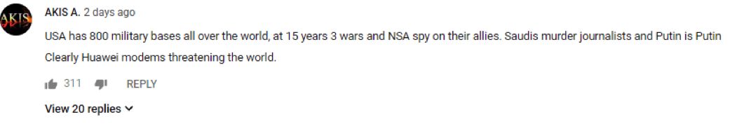 上面这两段获得大量点赞的言论,是美国《华尔街日报》在境外视频网站Youtube上的一篇关于“美国为何视华为为威胁”的视频报道下,国外网友们自发写下的感想。