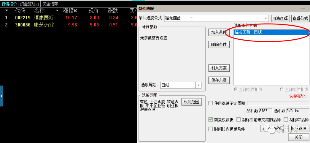 今天的涨停板中就有很多的医药股,用了阿荣的猛龙回首选股器,发现两只猛龙回首股全都是医药类个股。恒康医疗底部首板,康芝药业在前面一根涨停板的基础上调整很久继续涨停,并且突破阿荣的牛熊线白线压力位,至此有望打开上涨空间。在医药强势的背景下可重点关注猛龙回首+医药个股!