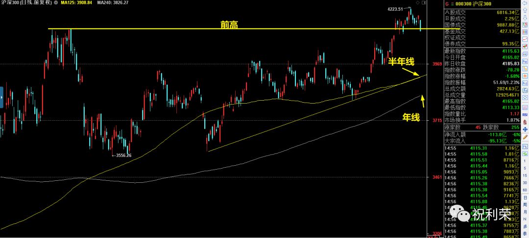 指数本身上是沪深300跌幅居前,沪深300一直是稳定向上的,短期的调整也不改长期下高速的趋势,现在突破前高需要调整,下方的年线和半年线偏移目前的价格较远,乖离率很大,需要进一步的调整,以待后续的继续的继续拉升,所以,未来较长一段实际内不排除行情在高位盘整,然后等待年线的不断向上,回踩一波半年线再上攻。