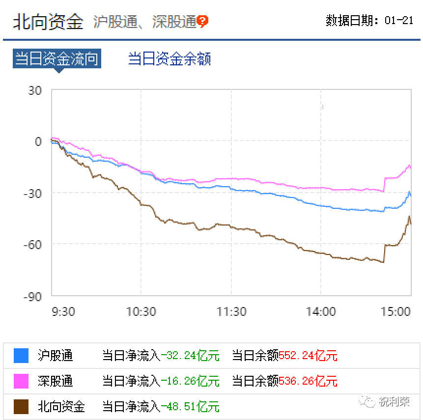 下行的另一个大因素是外资,外资之前的连续进场后,今天终于出现了难得的北向资金流畅的情况了,截止收盘,北向资金一共流出了48.51亿。但是和之前的大幅度流入作对比,今天的流出也只是九牛一毛,而且尾盘有开始适当的回升流入,说明北向资金并不是一去不复返的,长期看他们还是会以净流入为主。