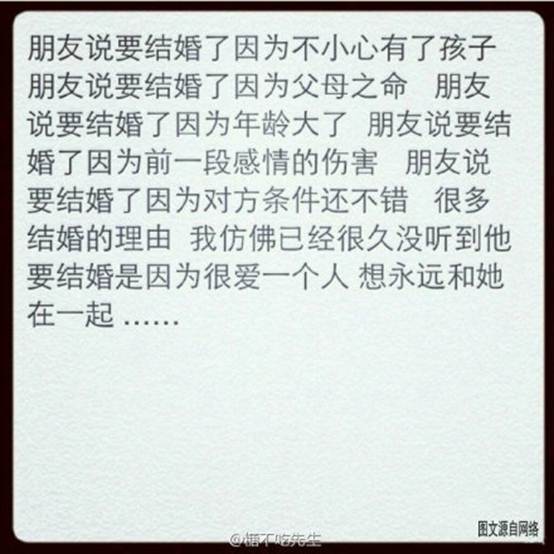 @糖不吃先生:我仿佛很久没听到要结婚是因为很爱一个人,想永远和她在一起。。。
