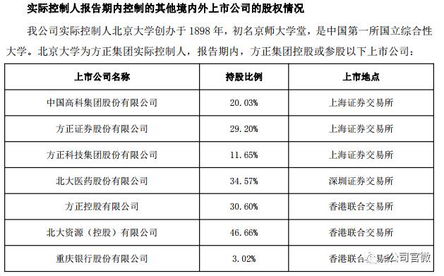 北大医药和方正集团同属北京大学实际控制,目前方正集团还控股或参股7家境内外上市公司,其中3家上交所上市公司,1家深交所上市,同时北京大学还通过北大资产经营有限公司,持有北京北大未名生物工程集团有限公司 40%的股权,后者持有未名医药(002581)26.38%的股份。