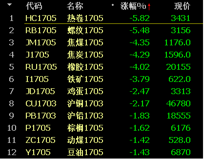 黑色系期货品种大跌,到上午10点40分,主要合约跌幅如下:
