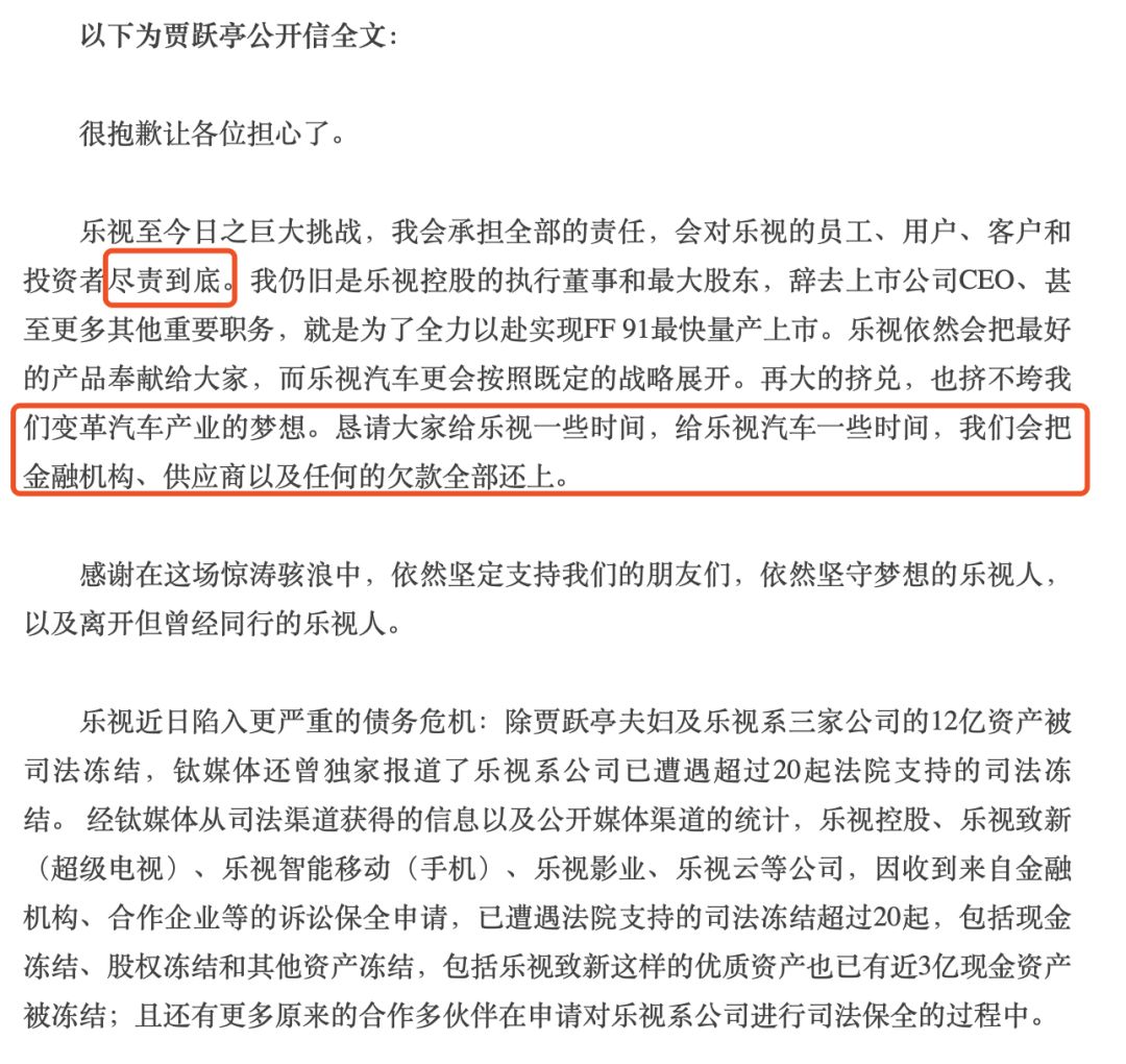 贾跃亭在2017年公开信中留下的那句“尽责到底”,至今仍然是一句空话。